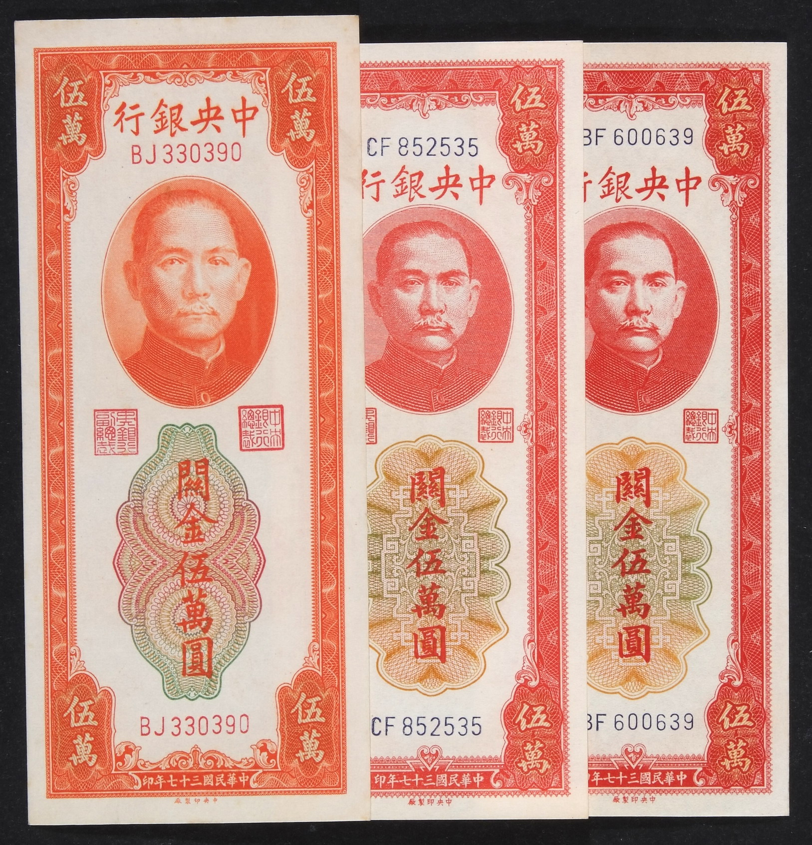 关于民国三十七年中央银行不同版式、不同加盖号码字体关金券伍万圆三枚的评论