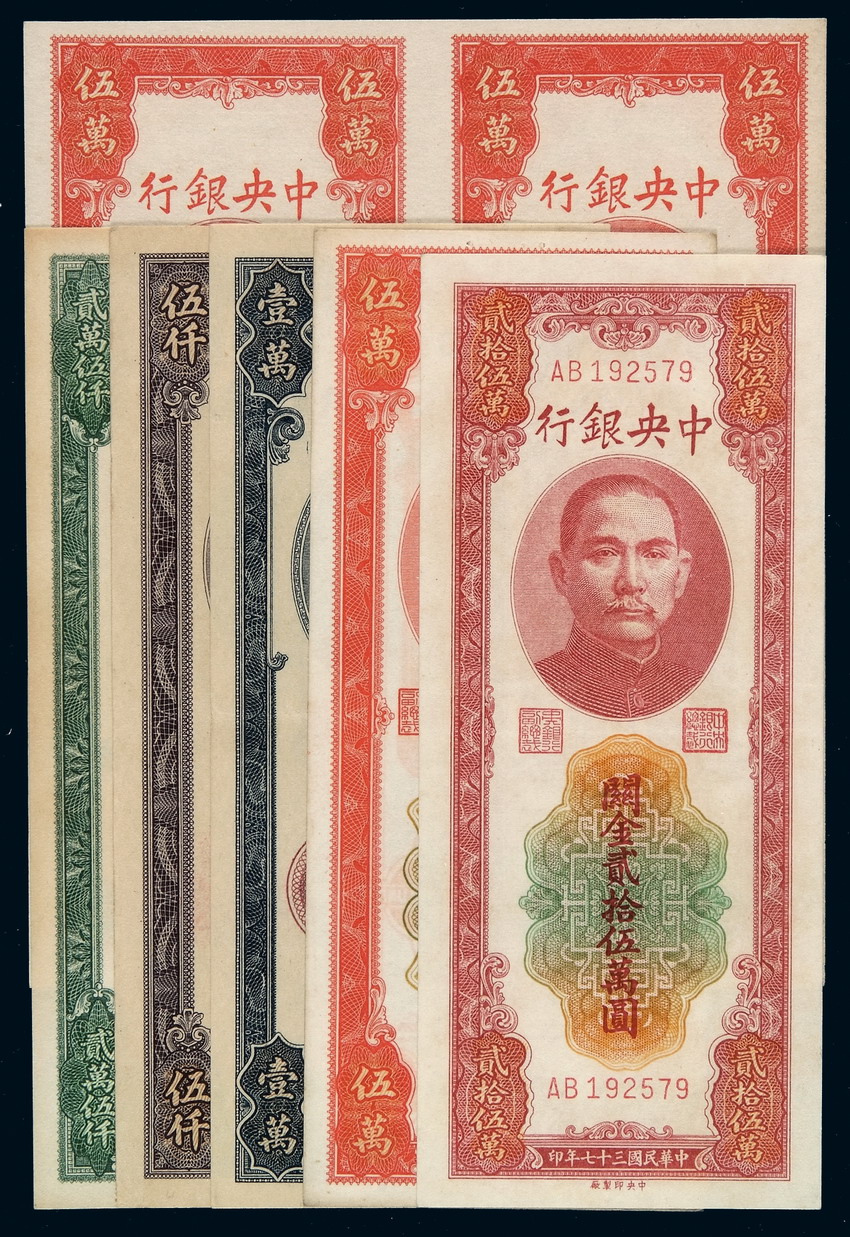 关于民国三十七年中央银行关金券伍仟圆、壹万圆、贰万伍仟圆、伍万圆、贰拾伍万圆各一枚;另有伍万圆未裁切横双连一件的评论