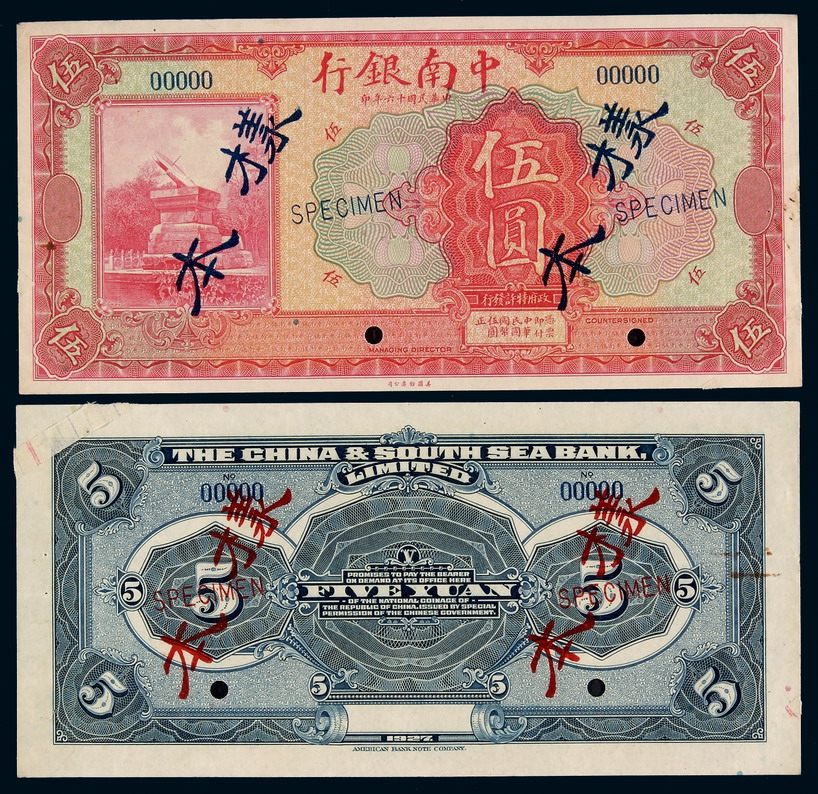 关于民国十六年中南银行国币券伍圆样本正、反单面印刷各一枚的评论