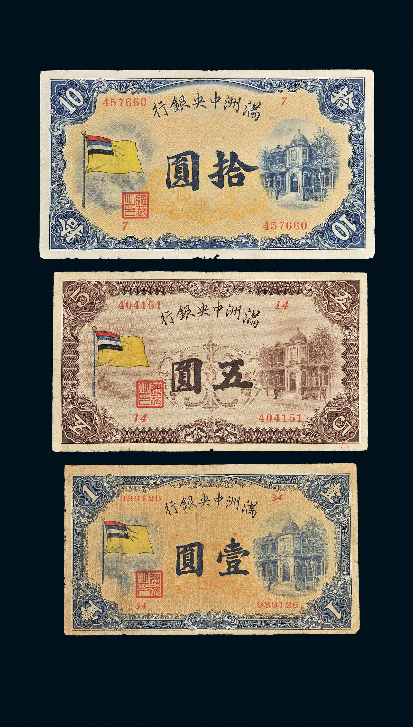 满洲中央银行纸币共7枚,详分:乙号券壹圆2枚、拾圆;丙号券五圆、拾圆2枚、百圆;状态自然,五至六成新