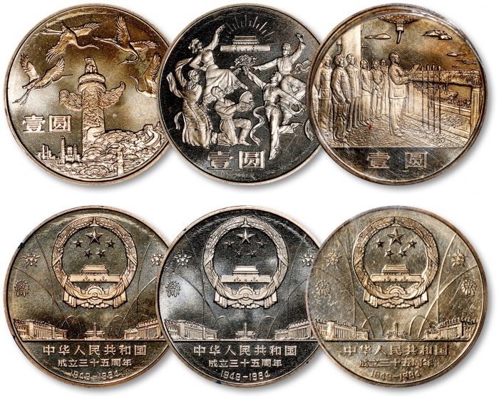 1984年中华人民共和国成立35周年纪念币壹圆精制币共三种全套,为中国人民银行发行之首套普通纪念币,由中国造币公司制造,原封包装,保存完好,完全未使用品