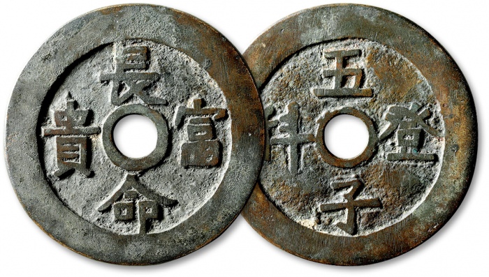 清“长命富贵”背“五子登科”花钱一枚,直径:47.2mm,字口清晰,包浆醇厚,极美品
