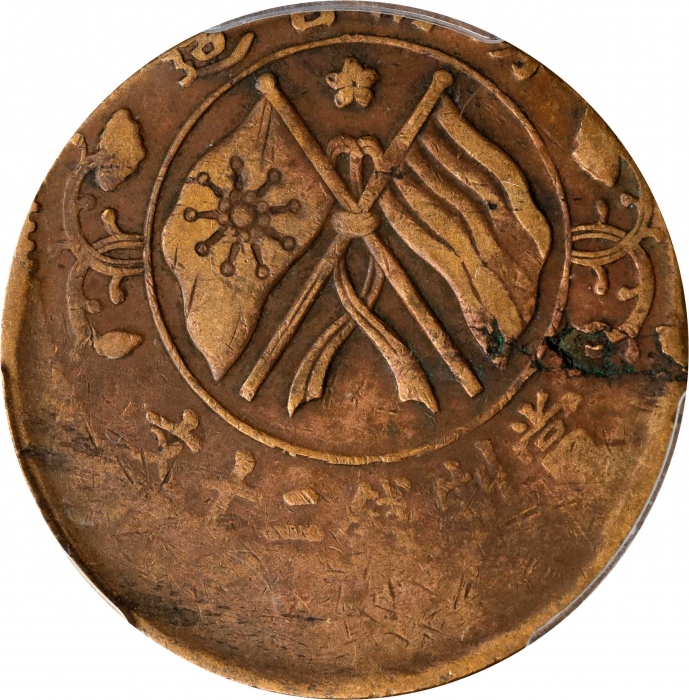 CHINA. Hunan. Mint Error -- Struck 20% Off Center -- 20 Cash, ND (1919). PCGS VF-25. CL-HUN.88; KM-Y-400.8. This interesting error issue circulated extensively but remains quite charming with its coppery surfaces.