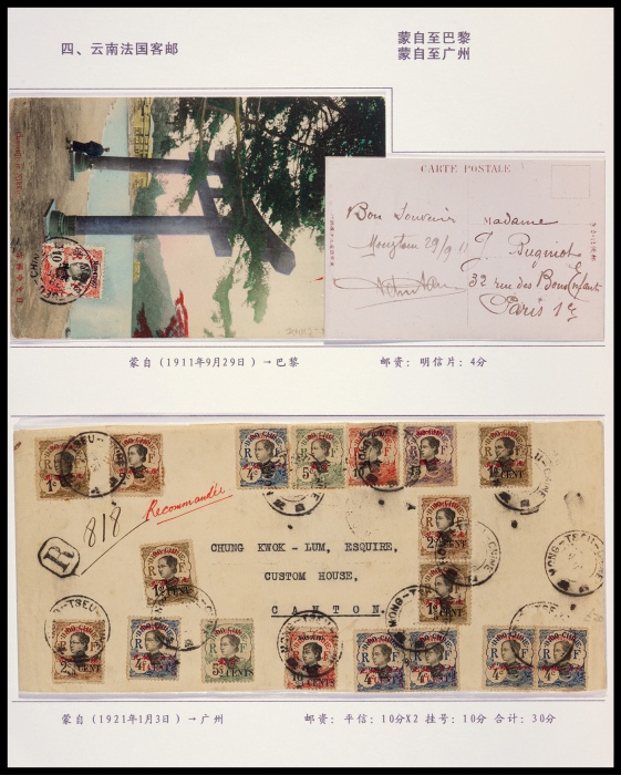 云南蒙自寄巴黎及广州封片一组2件:1911年蒙自寄巴黎彩图明信片,贴法国客邮安南妇女图加盖蒙自4分邮票一枚,盖蒙自9月29日戳;1921年蒙自寄广州挂号封,贴法国客邮安南妇女图蒙自加盖改值中国币值票18枚,合计符邮资30分,保存完好,销蒙自1月3日戳,保存完好 ...