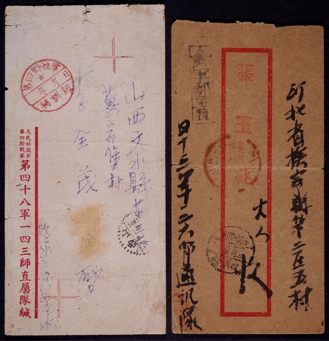 四野军邮封一组2件:四野部队第四八军一四三师直属队中式公函封1951年寄山西文水,盖“第四野战军补训师 年 月 日”三格式手填红色军邮戳,落地山西文水1月21日到戳;1948年四十三军一二六师通讯队寄河北封,盖四野红色军邮手填戳及“军邮免费”戳,有落地戳<br><br>历史背景 ...