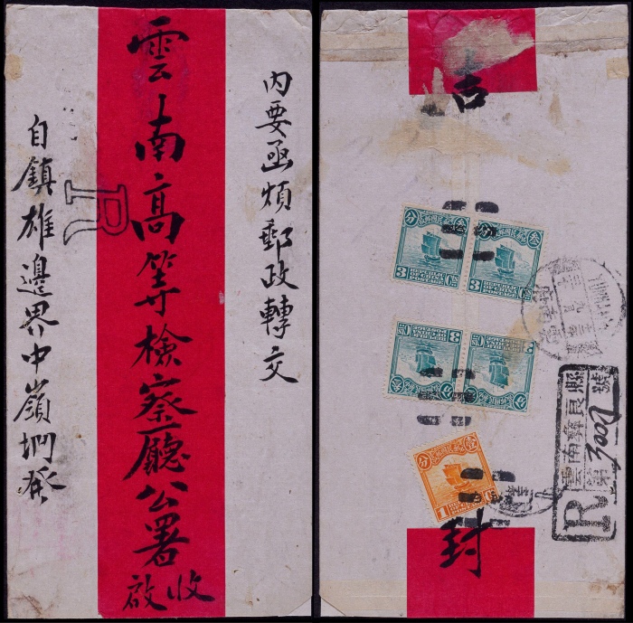 1940年云南金官寄云南府双挂号封,红框封正贴香港版孙中山像5分六枚、背贴北平版烈士像1分四枚,双挂号邮资(信函8分+挂号13分+回执13分),销“云南金官 年 月 日”三格手填戳,经云南口县十二月二日中转,落地云南府12月15日到达戳,封品完好,手填戳实寄封少见 ...