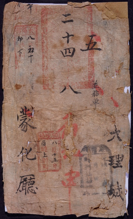 光绪二十四年(1898年)大理寄蒙化厅云南邮驿手填戳官封面,此封上钤官印三方,由大理光绪二十四年八月初伍申时发出,邮驿路经转分盖:太阳站(八月初十到)、围埂站(八月十五日到)、苍宏站(八月二十二日)等不同款式碑形手填戳,云南发现最早的排单式驿站封,目前仅见四件 ...