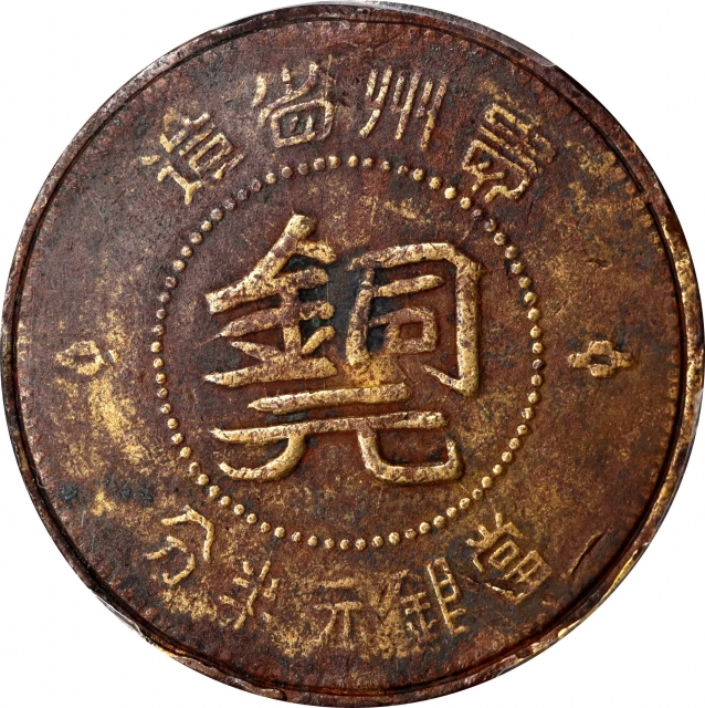 民國三十八年貴州省造黃銅元半分。花瓣相连。有磨损,但细节仍清晰,铭文明瞭可见。虽此版通常压铸粗糙,评级分数中亦有反映,但其為中国歷史长河中最后的省造发行之一,吸引力丝毫不减。(t) CHINA. Kweichow. Brass 1/2 Cent, Year 38 (1949). PCGS Genuine--Environmental Damage, VF Details.CL-MG.140; KM-Y-A429A. Variety with connected rosettes. A rather elusive offering, this worn example delivers presentable details, with fully readable legends and the sparse design elements being fully accounted for the planchet. Despite the crudity of the issue, along with the noted by PCGS, this brass issue can maintain its charm on account of its place in the history of Chinese coinage, being one of the last provincial issues.