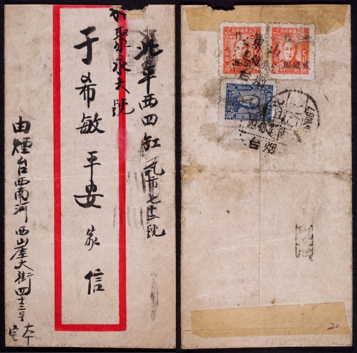 华东区1949年烟台寄北平封,贴青州一版毛像蓝色100元一枚、暂作贰百元两枚,北海币500元,折合人民币邮资5元,销山东烟台4月5日戳,有北平四月廿一到达戳,青州一版毛像蓝色100元为全套总筋,实寄封罕见,保存较好 ...