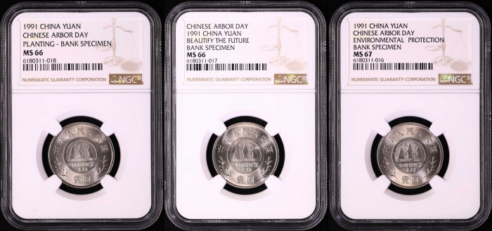 第200693号:1991年植树节工作币 NGC MS67/67/66,串号连续。产量16000套,附带原包装,少量留入民间。估价:10000--16000