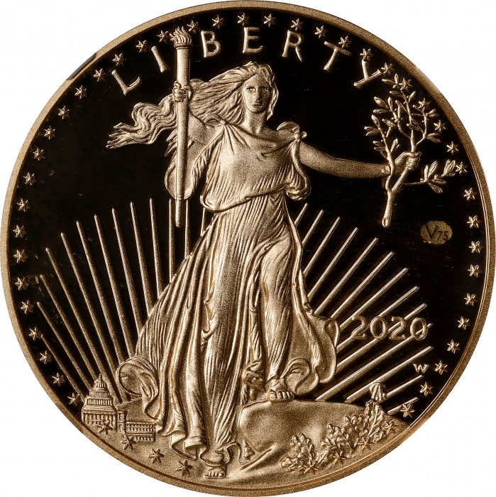 2020-W One-Ounce Gold Eagle. 75th Anniversary of the End of World War II V75 Privy Mark. First Releases, 1 of 1945 Struck. Proof-70 Ultra Cameo (NGC). PCGS# 819295.