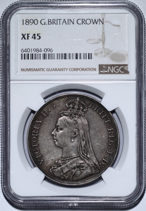 第200415号:1890年英国1克朗马剑银币 NGC XF45,原味老包浆,味道一流。估价:800--1500