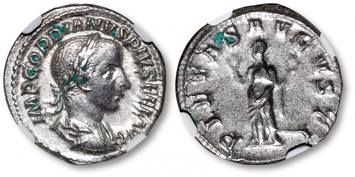公元238-244年罗马帝国“皇帝戈迪安三世像”迪纳里银币一枚,NGC XF(4972149-010)