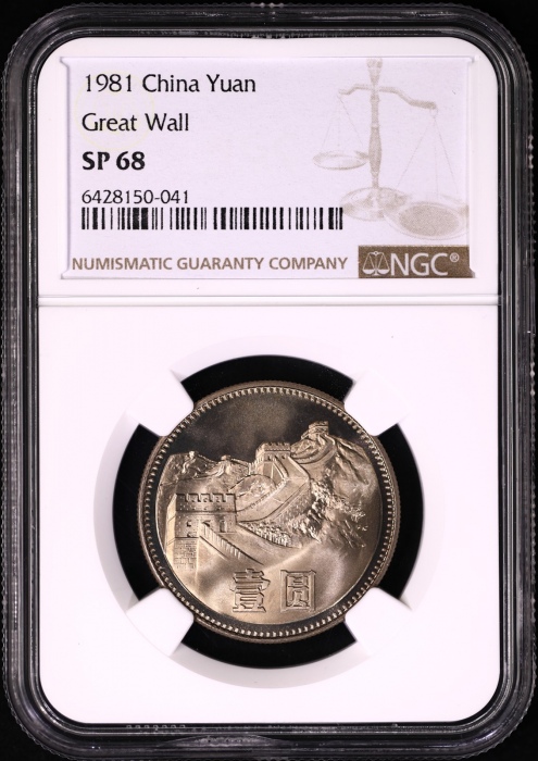 第200104号:1981年普制长城1元 NGC SP68(上海版),原始光泽,正面壹字轻微氧化痕迹。估价:9000--15000