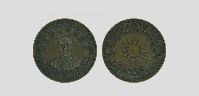 1940民国二十九五月蒋介石像抗战必胜背中央造币厂桂林分厂二周年纪年建国必成铜章,2.62*0.16cm,7.0g