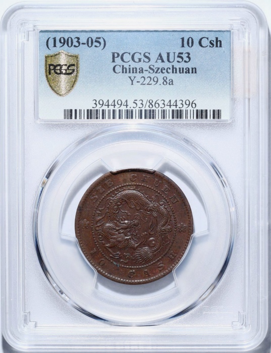 第200413号:四川省造光绪元宝当十铜币 PCGS AU53,深打,巧克力包浆,高点略有磨损。有明显背逆。估价:800--1500