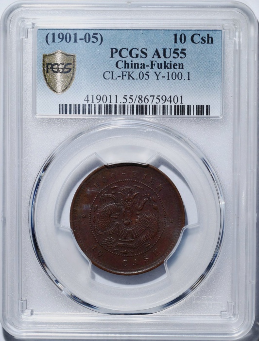 第200412号:福建官局造光绪元宝十文铜币 PCGS AU55,巧克力包浆,图文压印深竣清晰,龙鳞完好,味道一流。估价:500--1000