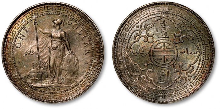 1900年香港不列颠尼亚女神站像壹圆银币一枚,打制规范清晰,深灰色五彩包浆,底光柔亮,状态上佳,近未至完全未使用品