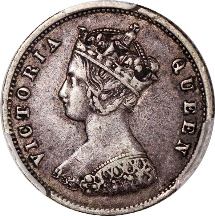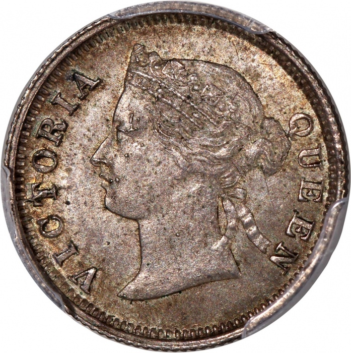 1873年香港维多利亚五仙,圆顶3版,PCGS MS62,#46484288,罕见年份,高分美品。Hong Kong, Victoria, 5 cents, 1873, round top 3, PCGS MS62. #46484288. Good example for a relatively scarce date