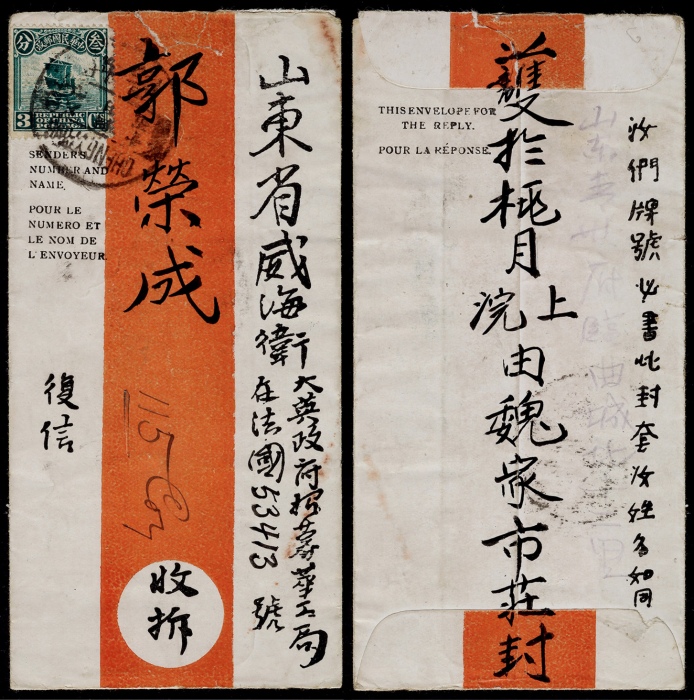 1919年城阳寄山东威海卫一战劳工封,红条封贴帆船3分一枚,盖城阳四月十五英汉腰日戳,发山东威海卫大英政府招蒙华工局,在法国53413号,封品完好,少见