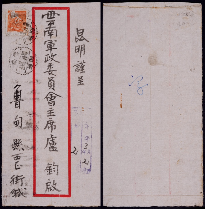 西南区1950年昆明寄本埠挂号封,西式封背贴云南加盖“西南人民邮政”单位邮票黑字/“挂号”、黑字/“平信”各一枚,销昆明(二)50.3.16汉英三格式发戳,落地昆明投递抬3.16全汉三格到戳,封品完好。此种邮票2月14日起至3月20日停用,封、片贴用实例极为罕见,是收藏组集西南 ...