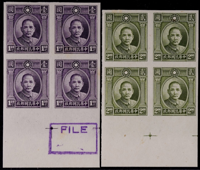 1946年伦敦三版孙中山像1元及2元无齿样票四方连,带下大宽纸边,上品