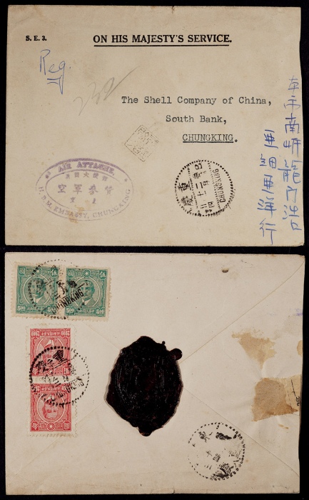 1946年重庆寄本埠英国大使馆空军参赞挂号封,西式封背贴重庆大东版孙中山像20元、5元各双连,计符挂号信邮资50元,销重庆2月13日汉英三格点线日戳,落地东川重庆2月14日全汉三格日戳,另盖英国大使馆中英文双圈紫色戳,背舌火漆封口完好,保存完好 ...