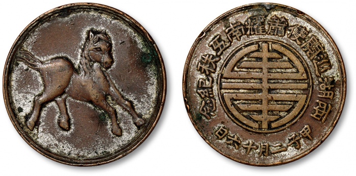 民国“甲子二月十六日两湖巡阅使萧耀南五秩纪念”背“奔马”纪念章一枚,铜鎏银,纹饰清晰,包浆自然开门,状态极佳,十分难得,罕见,极美品