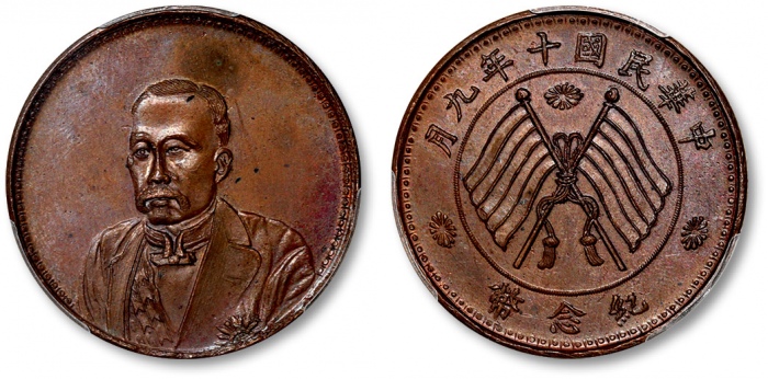 民国十年九月徐世昌像臆造铜质纪念币一枚,此币打制深峻,人像清晰精美,底板平整光洁,原味巧克力包浆带底光,边缘及图文之间透出原始红光,品种少见,品相极为难得,金盾PCGS MS63BN(88102731),为此公司此品种第二名分数且入盒仅此二枚 ...