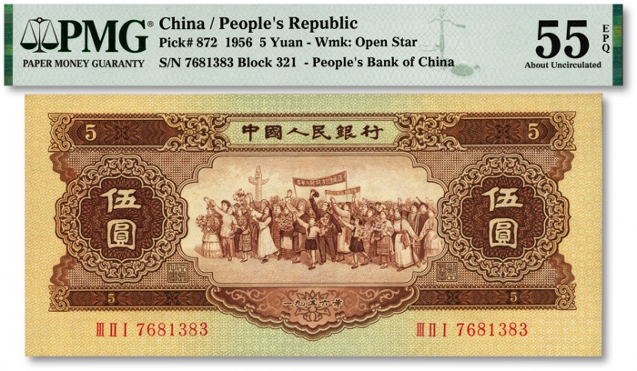 1956年中国人民银行第二版人民币5元一对, 编号 IV III V 1868100 and IV III V 9853337, 星水印. PMG 55。 Peoples Bank of China, 2nd series renminbi, 1956, a pair of 5 yuan, serial number IV III V 1868100 and IV III V 9853337, open star watermark,(Pick 872), both graded PMG 55 About Uncirculated (2).