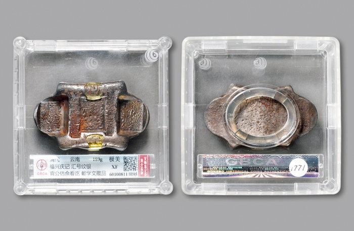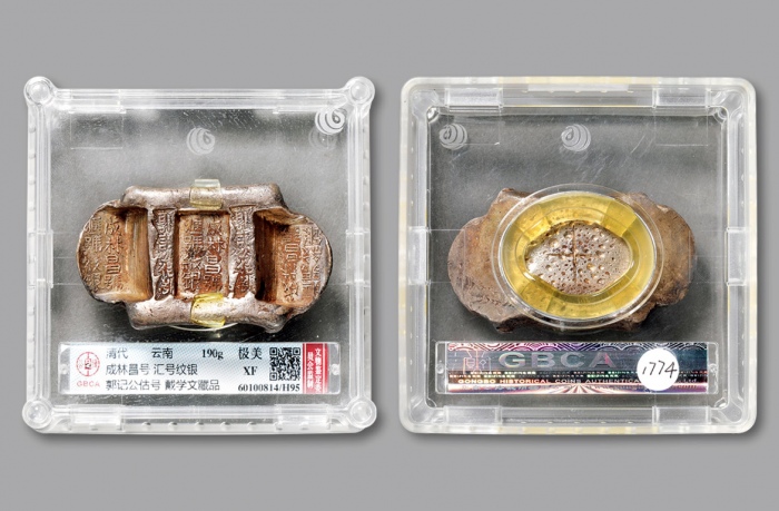 清代古钱4枚一组,包括康熙通宝2枚,乾隆通宝1枚及道光通宝1枚,分别评中乾82,82,85及75。 Qing Dynasty, a group of 4x coins, consists of 2x Kiangxi Tong Bao, 1x Qian Long Tong Bao, and 1x Dao Guang Tong Bao, graded Zhong Qian 82, 82, 85 and 75 respectively (4).