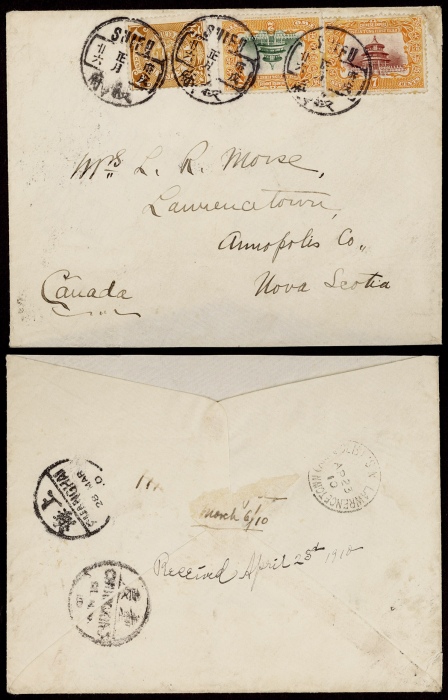 1910年四川叙府寄加拿大封,西式封贴宣统纪念7分、2分及蟠龙1分各一枚,计符邮资10分,销叙府庚戌正月廿六英汉腰框干支日戳,背盖重庆3月21日、上海3月28日中转汉英半切小圆戳各一枚,落地加拿大4月23日到达戳,邮程历时一个多月,封品完好 ...