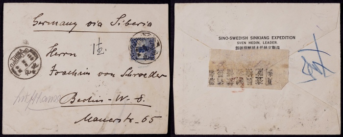 1928年新疆迪化寄德国检查封,“新疆游历团主任赫定斯温”中英双文字西式封,贴北京一版帆船10分一枚,销迪化十七年五月廿五英汉腰框日戳,此封由瑞典考古学家亲笔书写寄发,封经检查背舌处并贴“新疆省长兼£查委员检查讫重封”条,少见品,封品完好 ...