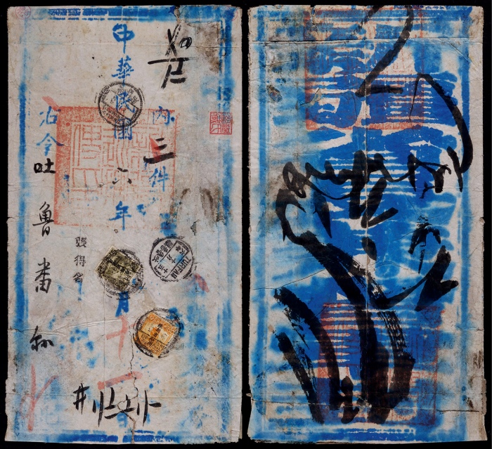1917年迪化寄吐鲁番新疆省军事公文挂号封,贴北京一版帆船“新省歪头”邮票1分及16分各一枚,计邮资17分(信函6分+续重6分+挂号5分),销迪化府六年十月十一英汉腰框日戳,落地吐鲁番厅十月十五日到戳,此封上并钤官印三方,保存较好 ...