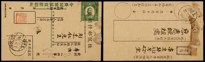 民国孙中山像2分半未发行邮资片改挂号回执1951年上海寄本埠,分盖上海廿四支7.27汉英三格点线收寄原局日戳,上海十八支七月廿八投递局日戳