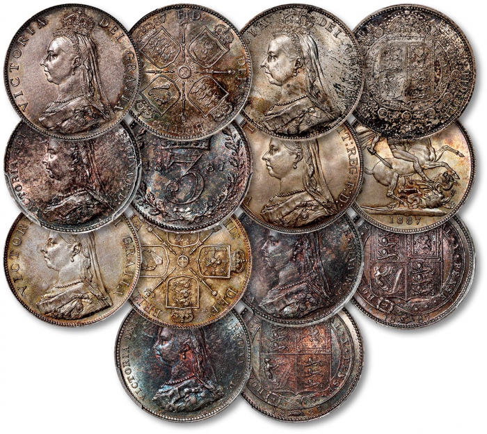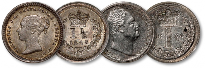 英国钱币5枚一组,包括1762/3年3便士,1787及1816年6便士,1787年1先令,及1817年1/2克朗大肖像版,首二枚评NGC UNC Details有清洗,其餘分别MS64,MS62及MS63,#2885392-010, 012, 015, 011及013,最后一枚為热门「公牛」版 Great Britain, group of 5 silver issues, consisting of: 1x 3 pence, 1762/3, 2x 6 pence, 1787 and 1816, 1x 1 shilling, 1787, with stop after III, and 1x 1/2 crown, 1817, large bust type,the first two graded NGC UNC Details (Cleaned), the rest MS64, MS62 and MS63 respectively, #2885392-010, 012, 015, 011 and 013. The final coin being a nice example of the popular Bull type. (5)