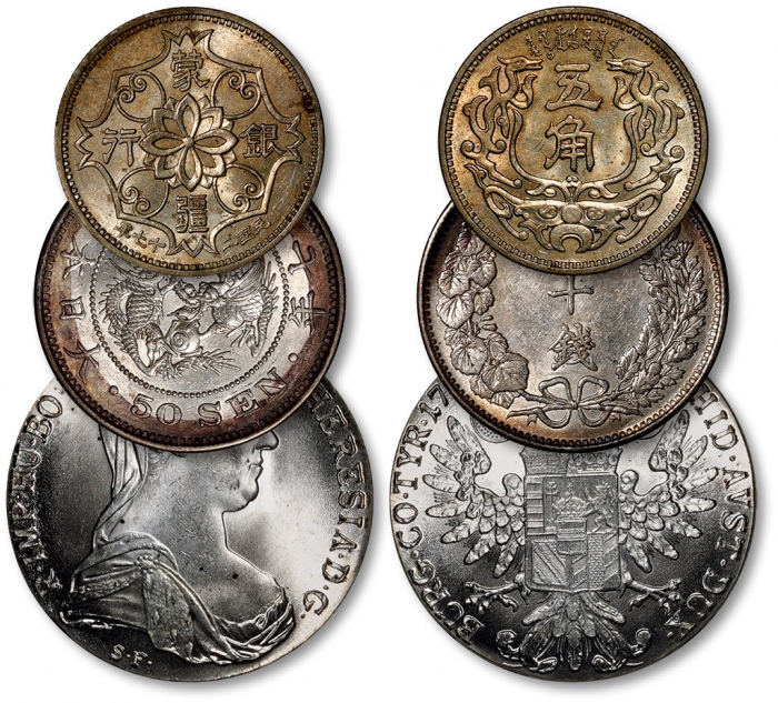 各国钱币共三枚不同,详分:日本明治三十七年五十钱银币一枚;蒙疆银行五角镍币一枚;后铸奥地利玛丽亚·特雷西亚女皇像泰勒银币一枚;打制清晰规范,状态自然,近未至完全未使用品