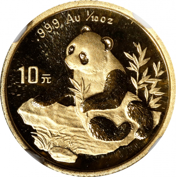 CHINA. 10 Yuan, 1998. Panda Series. NGC MS-69. Fr-B7; KM-1127; PAN-306A. Small date variety. Metal flow lines enhance the impact of the frosty devices on this near-perfect specimen of this attractive issue.