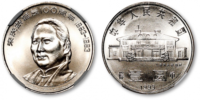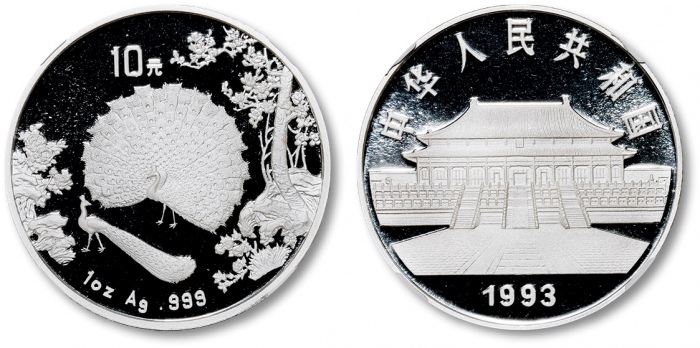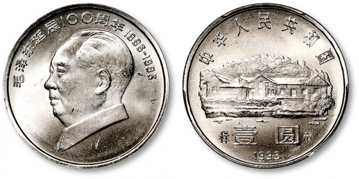 1993年中国10元精铸银币,毛泽东诞辰一百週年,UNC,发行20,000枚。 Peoples Republic of China, silver proof 10 yuan, 1993, "Anniversary of the Birth of Mao Zedong, uncirculated. Mintage 20,000 pieces