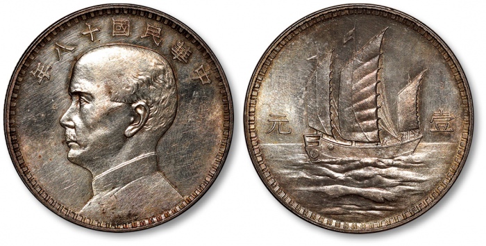 民国十八年孙中山像背三帆船壹圆银币样币一枚,意大利版,杭州造币厂试铸,未发行,打制深峻精美,压力十足,镜面版底,光洁平整,人像生动传神,浮雕感强烈,栩栩如生,原色闪亮银光,光泽炫丽,品相一流,品种极为少见,金盾PCGS SP63(80311708)为此公司此品种仅六枚之第 ...