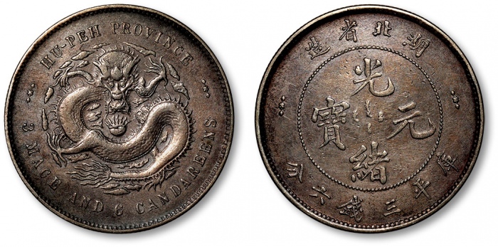 清湖北省造光绪元宝库平三钱六分银币一枚,打制规范清晰,原味酱彩包浆,状态自然,极美品