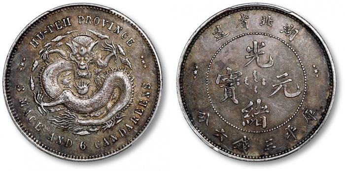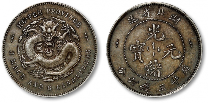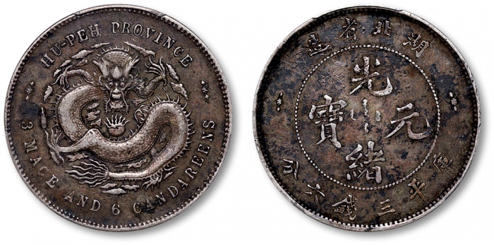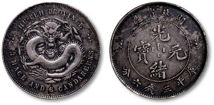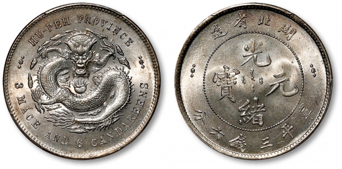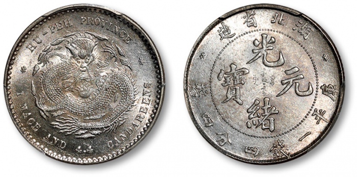 清湖北省造光绪元宝库平三钱六分银币一枚,打模深峻规范,边齿挺拔利落,底版光洁细腻,图案文字立体饱满,原色车轮旋转光泽,银光柔亮,品相状态极佳,十分难得,金盾PCGS MS64(80118931),高于此分数者仅三枚 ...
