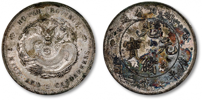 清湖北省造光绪元宝库平三钱六分银币一枚,打模深峻规范,边齿挺拔利落,底版光洁细腻,图案文字立体饱满,深色五彩包浆,旋转柔亮粉光,品相状态极佳,十分难得,金盾PCGS MS64(12853888),高于此分数者仅三枚 ...