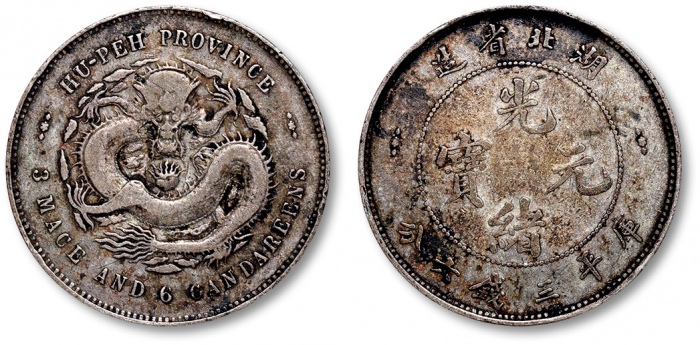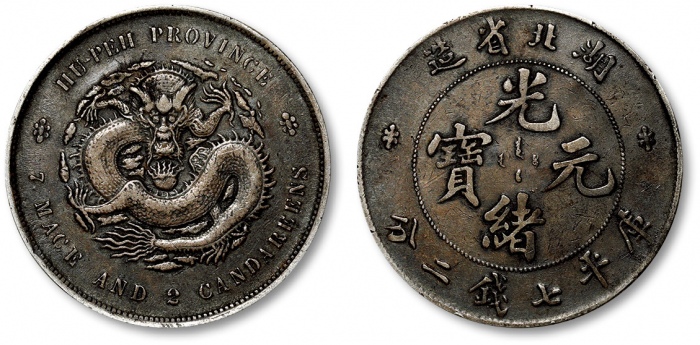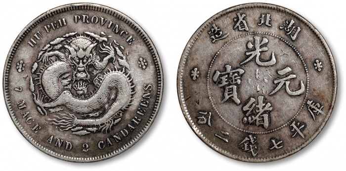 清湖北省造光绪元宝库平七钱二分银币一枚,整体图案清晰,深色老包浆带底光,状态自然,极美品