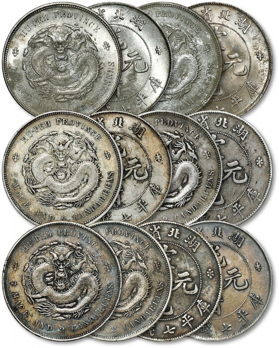 清湖北省造光绪元宝、宣统元宝库平七钱二分银币各三枚,共计六枚,打制规范,整体清晰,酱彩、灰色包浆及原色银光,状态自然,极美至近未使用品