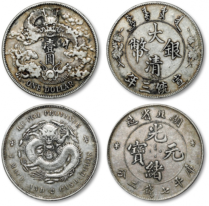 清湖北省造光绪元宝库平七钱二分银币一枚、宣统三年大清银币壹圆一枚,共计二枚,整体清晰,灰色包浆,极美品
