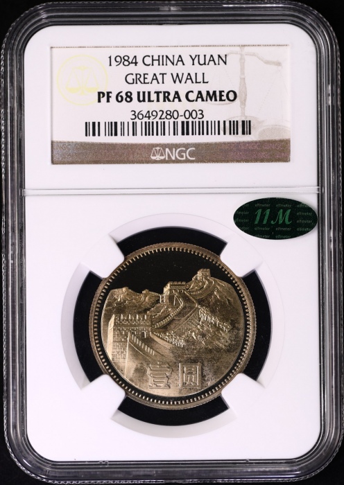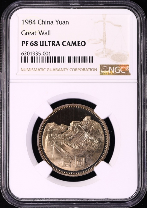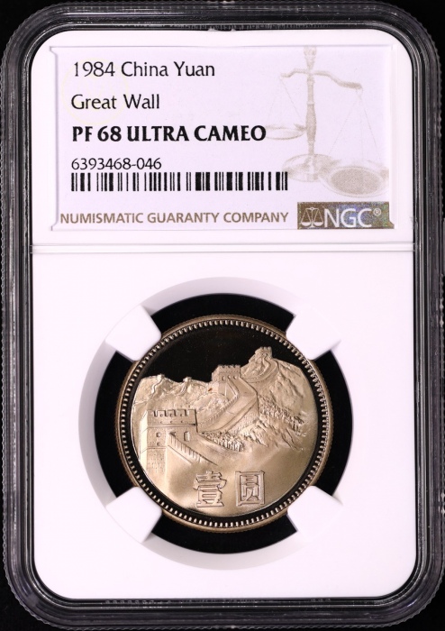 第200218号:1984年精制长城1元 NGC PF68UC(沈阳版),原始光泽,背面状态好于正面,正面上方存在氧化,背面国徽喷砂异常精美。估价:12000--20000