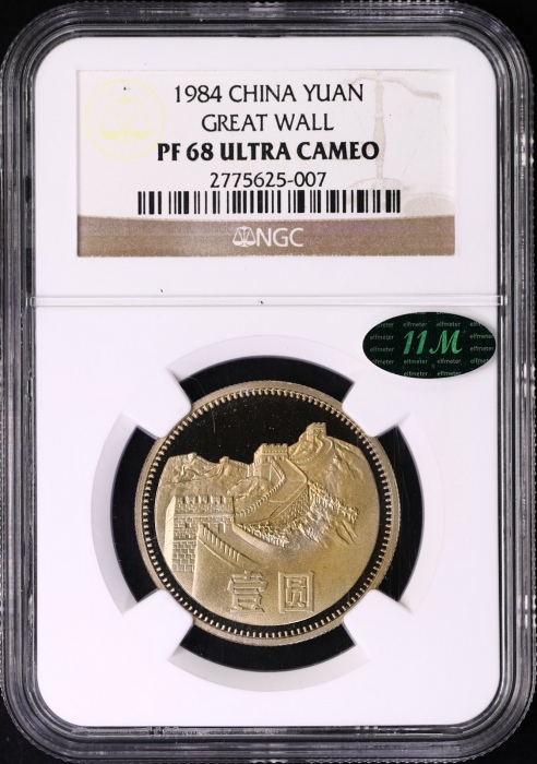 第200214号:1984年精制长城1元 NGC PF68UC(上海版),淡黄色包浆,正面状态优美,正上方云朵一样氧化痕。背面国徽右侧条状痕迹,应为原始坯饼痕迹。估价:22000--30000