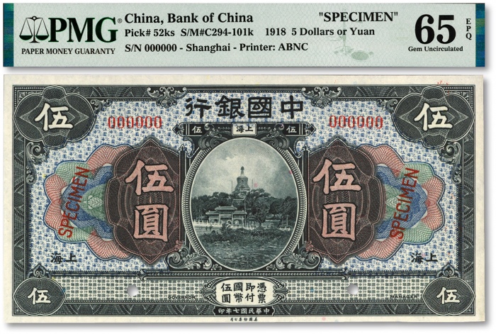 民国七年(1918年)中国银行蓝黑色伍圆样本券,上海地名,纸张自然波纹,色彩醇正,品相上佳,九八成新(仅12枚之季军分,更高分仅12枚)