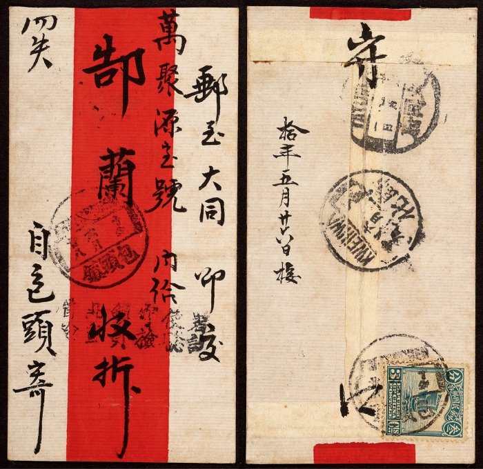 1921年包头寄大同检查小型红条封,背贴伦敦版帆船3分一枚,销包头镇五月廿八英汉腰日戳,经归化六月廿九中转,落地大同府七月一日到达戳,封经检查,正盖“晋北镇守使署检查员检验讫”无框左读式文字戳,较少见,封品完好 ...